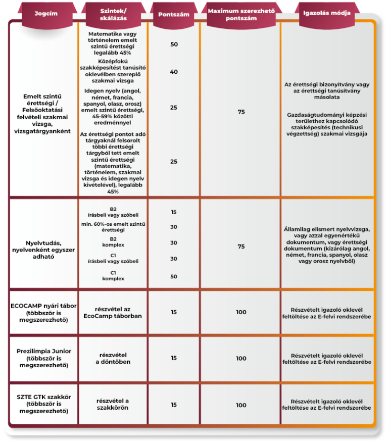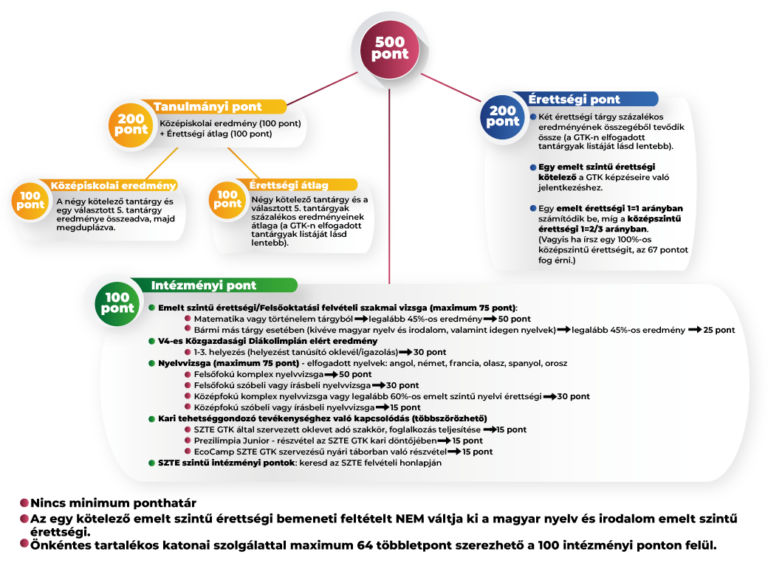 Az SZTE GTK a középiskolai eredmények számításához ötödik tantárgyként minden tárgyat elfogad.