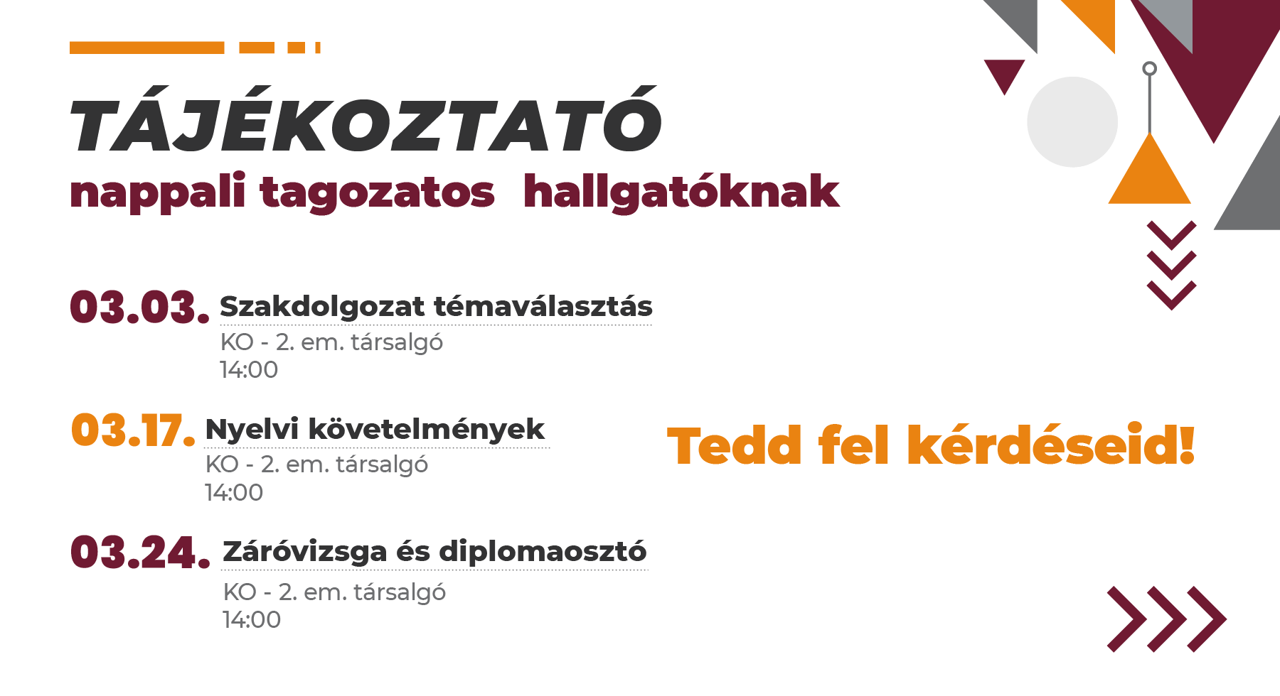 - 2026. március 24. (14:00-15:30): Záróvizsga és diplomaosztó - KO II. em. társalgó